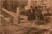 Bowers notes that St. Elmo was filmed in a mansion built in 1759, but the name and location of the structure is unknown.[1] The actual date of the filming is unknown. During the weeks leading up to the release, a spy for Thomas Edison's production company recorded details surrounding Thanhouser's production, including the filming of Thanhouser's first release, The Actor's Children.[11] The spy, W. E. Lowenkamp, had a New York State Detective license.[12] Lowenkamp's reports suggest the possibility of filming in a house on March 10, 1910 and the intention to film the following morning, but it is unknown if this was related to St. Elmo's filming.[11] Lowenkamp would speak to Edwin Thanhouser's sister in law, Carey L. Hastings, who took him as a real estate salesman was in film. Bower's reprints the report, "The sister-in-law said the house they were using to take pictures would just suit Mr. Thanhouser, so I called a real estate office and gave them the tip so they will try and sell the house to Mr. Thanhouser and cover me."[11] The film also included Gertrude Thanhouser, the wife of Edwin Thanhouser. According to family tradition, she only appeared in this one film.[13]