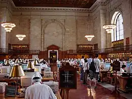 New York City has three public library systems, the New York Public Library, serving Manhattan, the Bronx, and Staten Island; the Brooklyn Public Library, serving Brooklyn; and the Queens Public Library, serving Queens.[48] The New York Public Library comprises simultaneously a set of scholarly research collections and a network of community libraries and is the busiest public library system in the world. Over 15.5 million patrons checked out books, periodicals, and other materials from the library's 82 branches in the 2004–2005 fiscal year. The library has four major research centers. The largest is the Library for the Humanities, which ranks in importance with the Library of Congress, the British Library, and the Bibliothèque nationale de France. It has 39 million items in its collection.