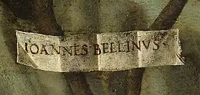 In Saint Francis in Ecstasy, Bellini used a combination of oil and tempera paints, perhaps having been under the influence of Antonello da Messina.The painting shows the influence of Andrea Mantegna, who was the painter's brother-in-law. It is signed IOANNES BELLINVS on a small, creased tag visible in the lower-left corner.[5] The original size of the painting was cut-down from the top side; this is evident because the painting continues completely to the end of the panel. However, the original painting would not be much larger than the present by estimation.[6] Saint Francis in Ecstasy was directed towards Art Museum Metropolitan for detailed cleaning and highly technical assessment of this painting by Scientists, Art Masters and Conservators, the painting had evidence of underdrawings.[4] The major findings such as compositional modifications, fingerprints, brushwork, sketching and the exposure of certain innovation belongs to the students of Bellini, i.e. Titian and Giorgione.[4] Though it has been cut down, it has otherwise been well-cared for since its creation.[6]