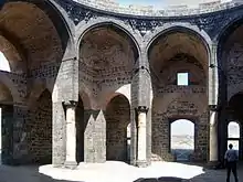 The western chamber is more spacious than the eastern one and its dome was higher.[3] The dome had partially collapsed by the early 20th century.[3] It was supported by eight piers, still standing today, between which are high arches. The four arches aligned with the dome's two central axes each form part of an iwan, while the arches at the four diagonal corners of the dome contain squinches. Some muqarnas masonry is found in the squinches, while the shallow pendentives between the eight arches are decorated with muqarnas stonework similar to that found on the Artuqid towers of the city walls.[3] Behind these arches, and running around the chamber, is a corridor covered by oval vaults. This corridor once surrounded the chamber on all four sides, but its eastern wing has since been walled off to form a separate narrow chamber between the main western and eastern chambers.[3] The former dome, the squinches, and most of the vaults are built in brick, while the supporting arches are made in stone.[3]