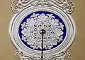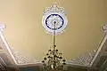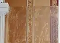 Inside, St. James Church is dominated by Potts' trompe-l'oeil frescoes, which cover all four walls beginning at the dado and rising to and covering the barrel vaulted ceiling. The walls are painted to simulate recessed panels which rise to a painted cornice. Potts then painted a row of coffers around the four sides of the ceiling which frame a large panel that is decorated with simulated plaster scrollwork. In the center of the ceiling is a painted medallion with a profusion of scrollwork. Apart from the ceiling, Potts lavished much detail on the wall behind the chancel, where four fluted pilasters rise to support an entablature and cornice, creating a visual opening to a barrel vaulted apse with coffered ceiling, all painted onto the flat wall. The frescoes conceal a door which opens into the vestry that is centered on the rear wall of the church. In the 20th century, Linda Croison and Philip Ward restored the frescoes, but preserved patches of Potts' original work in the back of the nave.
