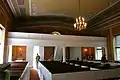 The interior furnishings are mostly of simple design. Slip pews with doors, each labeled with roman numerals, span the nave in four sections and extend along each side to frame the chancel. A balustrade with turned balusters spans the three sides of the chancel, opening with two gates at the back wall on each side. The gallery extending across the rear of the nave is accessed by a central staircase. Two flights rise along the back wall from each door to a shared landing, where a flying stair continues up to the gallery floor.