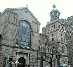 The Italianate / Baroque Revival church was built 1898–1900 to the designs of Delhi & Howard.[3] It is located on the southeast corner of Alexander Avenue and East 138 Street.[2] The New York Times reported on June 13, 1898, that "ground will be broken in a few days for a new church.... the new edifice is to cost about $100,000, and when completed will be one of the finest churches in the Borough of the Bronx. For several years past the present church, which is very old has been inadequate to meet the demands of the growing congregation. Plans for the new structure have been prepared by Dehli and Howard, Architects of 1193 Broadway. The church will be of brick and Dorchester stone, and will have a frontage of 80 feet on Alexander Avenue and a depth of 156 feet. One tall bell tower and two smaller towers will surmount the front of the building....The church proper will have a seating capacity of about 1,000 in the body and a gallery which will run back to the transepts, will accommodate about 400...."[1]