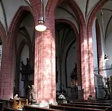 The almost square groundplan of the building is divided into nine sections. The three aisled late Gothic nave has a square choir at one end, flanked by a southern side choir and a northern passageway containing the organ loft. The three bays of the west end of the nave are of equal size. A trapezoidal crossing space permits a wider choir bay at the east end. The central bay at the west end supports the tower, which is not visible from inside the church, since the mass of enormous, high-spired tower is distributed onto the pillars without variation in the height of the roof vaults.[1]