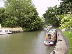 The Lechlade hospital (hospitalry) also recorded as priory during its existence maintained St. John's bridge; it is known the prior was bestowed grants of pontage in 1338, 1341, and 1388.[5] Later the bridge comprised two large and two small arches and there was a causeway of more than 20 arches across the south meadows.[5] A gateway to the bridge was built by Peter FitzHerbert in 1228 later converted to a larger building known as "Noah's Ark" in 1716.[5] By 1831 the bridge was dilapidated and an inconclusive dispute over the liability to repair it arose between the county and the occupiers of the former hospital (priory) lands.[5] The county later accepted responsibility, employing a local builder, Peter Cox, to rebuild the bridge as a single arch.[5] In the late 17th century and early 18th the right to take toll was disputed by the bargemen and in the time of Sir Thomas Cutler led on one occasion to the arches being chained over.[5] In 1791 the difficulties of passing the main bridge were avoided when the navigation commissioners for the upper Thames by-passed it with a deepened cut to the immediate south of the old bridge suitable for barges in which they built a lock.[5] The Thames and Severn Canal from Stroud to Lechlade was opened in 1789, the junction with the Thames being 1 km. southwest of the town where a watchman's house was built. Long-distance river traffic had fallen and the canal was closed in 1927.[5]