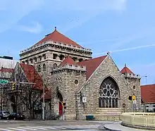 In 1891, the original building was razed to make room for a larger facility, which was completed in 1892. The architect for the current building was J.W. Yost of Columbus, Ohio. The stone church is built in a Latin cross form, but the nave, transepts, and apse are minimal in size compared to the crossing, resulting in a large central space. The architectural style is Richardsonian Romanesque. Features include a slate roof, turrets, buttresses, and rose windows.[2]