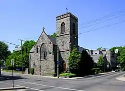 St. John's Episcopal Church is a historic Episcopal church in Roanoke, Virginia, United States. It was built in 1891–1892, and is a Gothic style blue-gray limestone church designed by Charles M. Burns of Philadelphia. It has a nave-plan with side aisles, a corner bell tower, a sacristy wing, and a transverse chapel and narthex to the rear. The nave features a hammerbeam roof and wooden arcading and is illuminated by stained glass windows in the clerestory and side aisle walls including several by Louis Comfort Tiffany. Attached to the church by a stone addition built in 1958, is a Tudor Revival style Parish House built in 1923.[3]