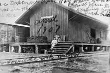 The St. Johns and Lake Eustis Railway was chartered in 1879 and construction started at Astor on the St. Johns River. The line was built 3 ft (914 mm) narrow gauge and its rails passed through Altoona, Umatilla, and Fort Mason before reaching Eustis, 27 miles, in 1880. Construction continued southward through Tavares, reaching Lane Park on Big Lake Harris, 7.5 miles, in 1882–83.[1] The line was then extended 15 miles from Fort Mason, around the north and west sides of Lake Eustis to Leesburg in 1884. The line originally served as a land bridge for the river and lake steamboats that provided transportation into the interior of Florida. Passengers and freight could come down the St. Johns River on steamboats from Jacksonville and transfer to the railroad at Astor for ports on Lakes Eustis, Dora and Harris. They could then transfer back to a lake steamer to continue to points further south.