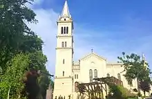 The Saint Joseph's Roman Catholic Church (Romanian: Catedrala Sfântul Iosif) is located on the north-eastern side of the citadel of Sighișoara, Mureș County in Romania, near the enclosure wall. Unlike the two other biggest churches of the city which were built by Transylvanian Saxons, this one was built by Hungarians. The monument was built between 1894 and 1896,[1] after the demolition of the Franciscan nuns monastery and was designed by the architect Franz Letz. It follows an eclectic style with both Gothic and Neo-Roman elements and has a total length of 30 metres (98 feet). On the northern side it has a very tall belfry. The current interior is the result of changes occurred after the fire of 1893.