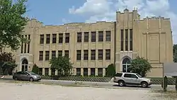 The main school building is a 2½-story, "T"-plan building of tan brick on a raised basement built in 1925. It sits on a stone-clad foundation and has decorative brickwork. It features projecting entry bays with recessed gothic arched entries and a parapet with stone detailing.[3][4]