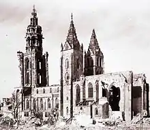 When World War II broke out, most of the art treasures, such as the altar or the stained glass in the church were moved to the tunnels of the salt mine in Kochendorf. On September 10, 1944, American incendiary bombs damaged the roof. The British attack on December 4, 1944, destroyed almost the entire church.[5] In April 1945, American artillery damaged the church even further.[6]