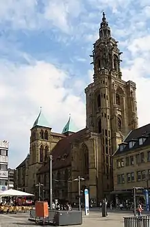 Kilian's Church on Kaiserstraße (Kaiser Street) in Heilbronn is a Gothic hall church constructed from Heilbronner sandstone, whose origin dates back to the 11th century. Its western tower, constructed by Hans Schweiner, is one of the first major Renaissance buildings to be built north of the Alps.[1] Inside the church there is an altar by Hans Seyffer from 1498, which is regarded as a masterpiece of sculpture from the Late German Gothic period. Some of the stained glass is by Charles Crodel. The Monument Foundation of Baden-Württemberg appointed the church as monument of the month in December 2016.