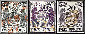 The St. Louis Bears are a set of Provisional stamps issued by the St. Louis Post office in 1845-46 to facilitate prepayment of postal fees at a time when the United States Post Office had not yet issued postage stamps for national use. St. Louis, whose postmaster, John M. Wimer, instigated the production, was one of eleven cities to produce such stamps. Bears were offered in three denominations: 5¢, 10¢ and 20¢; the earliest known postmark date on a stamp of the issue is November 13, 1845.