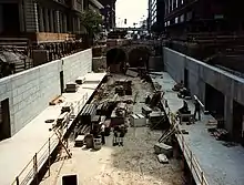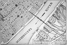 The designer of the Eads Bridge, James B. Eads, worked out the specifications for the tunnel.[2] It would be a “cut and cover” tunnel 4,880 ft long, 30 ft below street level. Several problems arose during construction of the bridge and tunnel including design changes, inflated land and labor costs, and renegotiated contracts that escalated construction costs 46% over initial estimates.[3] Despite this, the tunnel between the Eads Bridge and the Mill Creek Valley was completed by June 24, 1874, and the bridge would formally open less than a month later on July 4.[3] A smokestack with a fan that pulled smoke from the tunnel was built near St. Charles Street and has since been demolished.[4]