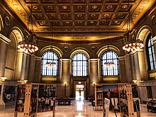 The Central Library building at 13th and Olive was built in 1912 on a location formerly occupied by the St. Louis Exposition and Music Hall and was designed by Cass Gilbert. The main library for the city's public library system has an oval central pavilion surrounded by four light courts. The outer facades of the free-standing building are of lightly rusticated Maine granite. The Olive Street front is disposed like a colossal arcade, with contrasting marble bas-relief panels. A projecting three-bay central block, like a pared-down triumphal arch, provides a monumental entrance. At the rear, the Central Library faces a sunken garden. The interiors feature some light-transmitting glass floors. The ceiling of the Periodicals Room is modified from Michelangelo's ceiling in the Laurentian Library. Renovation and expansion of the building began in 2010 and finished in 2012.[4]