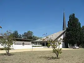The soaring spire of the church building it shares[1] with Holy Cross Anglican congregation is a major landmark in North Canberra, at the intersection of the four suburbs of Watson, Dickson, Downer and Hackett.[2]