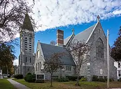 The church occupies a lot between Summer and Pleasant Streets a short way west of downtown Augusta. It is built out of quarry-faced granite, with a gable-roofed main section oriented east-west and two south-facing gabled projections. The western of the two projections has a tall square tower, with buttressed corners, belfry, and pyramidal roof topped by a cross. Windows are either lancet-arched in the Gothic style, or rectangular, and are decorated with tracery. The interior includes marble columns and detailed high-quality woodwork. The chancel ceiling has original stencil decorations.[7]