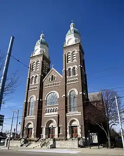 The current St. Mary's Church is a Romanesque Revival structure built in a mix of brick and stone. Constructed according to a design by John B. Vermont,[5] the design features two massive clock towers on the three-bay facade. Three large doorways piece the facade at the top of a staircase, with occasional large windows and numerous pairs of narrower windows on higher levels. Each window is topped with a dormered dome above the clock.[6] Built at a cost of $125,000 (or $3240741 in 2013 dollars),[2]: 359 the church is a landmark because of the twin towers; during World War II, Army aviators used it as a waypoint when navigating to the runways at Wright Field.[6]