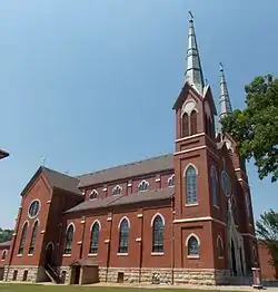 The parish was established in 1851.[2] The parish's first church building was a 20-by-28-foot (6.1 by 8.5 m) frame structure built in 1851 on the north side of town.[3] A 30-by-50-foot (9.1 by 15.2 m) brick church was constructed two years later and the original frame church was converted into a school. Plans to replace it began in 1865, but disagreements about where to build it doomed the effort. Eventually, it was decided to relocate the parish property and a new stone church was completed in 1874.