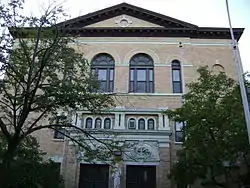 Its historic buildings include the parish church, completed in 1926, an Italian Renaissance Revival style, brick, stone, and terra cotta church with a gable roof which features a three-stage bell tower at the projecting center bay and Corinthian order columns. Also on the property are the contributing four-story rectory (1910), school (1909, 1913, 1950), and convent (1914).[2]: 3, 8, 10–12 The entire complex was listed on the National Register of Historic Places in 2012.[1]