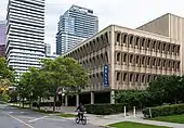 Examples of early post-war architecture at the college include Carr Hall, designed by Ernest Cormier and built in 1954, housing faculty and administrative offices, classrooms and an auditorium. At the northern edge of campus, Elmsley Hall was built in 1955 as a men's residence and a new residence for the Loretto College was built in 1958. The brutalist concrete building of the John M. Kelly Library was opened in 1969, at the southern portion of the college on St. Joseph Street. The former Ontario Research Council building next to the library has been redesigned with classrooms and offices as the Muzzo Family Alumni Hall.