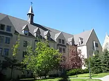 St. Michael's College was founded in 1852 as a Basilian college by Fr. Jean-Mathieu Soulerin and other members of the Congregation of St. Basil originally of Annonay, France.[3] The following year, it merged with St. Mary's Lesser Seminary under the unified control of the Basilian Fathers, whose establishment in Canada began with Bishop Armand-François-Marie de Charbonnel.[4] St. Michael's College educated pupils at three levels, operating as a preparatory school, as a liberal arts college, and as a minor seminary. The Basilians received a large estate in 1853 from John Elmsley, son of the Chief Justice of Upper Canada and a prominent philanthropist. St. Michael's College relocated to the new site east of the University of Toronto, and established the college parish, St. Basil's Church. The incorporation of the college was granted Royal Assent in 1855.