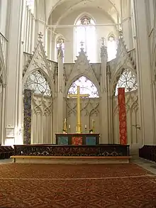 The church is constructed solely out of brick. It has the form of a basilica with a nave and two side-aisles. The nave is somewhat higher than the aisles; both the nave and the aisles walls have pointed, Gothic windows. The eastern wall has a trapezoid form and a richly articulated facade. The roof of the nave is made of copper, while the covering of the aisles are made of brick.