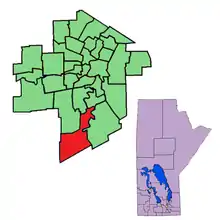 It was recreated by redistribution in 1979, and was contested at the 1981 Manitoba general election. It was abolished at the redistribution of 2018 and ceased to exist under its old name effective at the 2019 Manitoba general election. The riding was located in the southernmost tip of the City of Winnipeg.