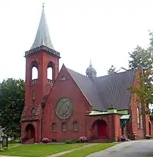 The church itself is located third from north. It is an asymmetrical brick building with cross-gabled roof topped by a cupola. Windows and doors are in rounded arches. The western (front) facade has a large, detailed rose window with quatrefoil tracery. Below it are three small stained glass windows with sandstone voussoirs. Another small window is above the rose window, in the tympanum.[1]