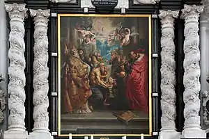 Pieter Verbrugghen I and his son Pieter Verbrugghen II created a Baroque marble main altar that was constructed around Rubens' painting The vision of St. Dominic. The Dominicans ordered in 1670 a new painting on the Martyrdom of St. Paul from Theodoor Boeyermans. This painting and Rubens' painting were installed in the new main altar and could be shown alternately through a rotating mechanism with hinges. Both paintings were robbed by the French occupiers in 1794 and sent to Paris. In 1811 Napoleon donated the paintings to two regional museums: Rubens' St. Dominic to the Musée des Beaux Arts in Lyon, and Boeyermans’ St. Paul to that of Aix-en-Provence. Despite the agreements of the Congress of Vienna of 1815 neither altarpiece was ever returned by France on the pretext that Napoleon had given them to regional museums. The painting The Descent from the Cross completed by Cornelis Cels in 1807 is now placed in the space occupied by the stolen altarpieces.[1][5]