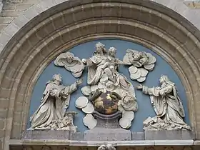 The initial phase of the rebuilding of the monastery was undertaken between 1605 and 1616 and reconstruction was completed in 1662. In 1618 the first stone was laid of a new and enlarged choir and transept. In 1639 the new choir was consecrated by the Bishop of Antwerp. During the following decades, the interior of the church was fitted out with Baroque furniture and decoration. The Antwerp sculptor Pieter Verbrugghen I and his workshop made the oak confessionals between 1658 and 1660.[3] The same artist made the oak organ case in the church in 1654 and together with his son Pieter Verbrugghen II he executed the designs for the high altar in 1670.[4] The high altar was dedicated in 1670 by Mgr. Capello of Antwerp. In 1679 a major fire destroyed part of the vaults of the nave and the upper part of the western facade. The damage was repaired in 1680-81 and at the same time the top of the tower was finished in a Baroque style after a design by Nicolaes Millich. In 1692 the Venerable Chapel was completed. The Calvary was constructed against the south side of the nave between 1697 and 1747.[2]
