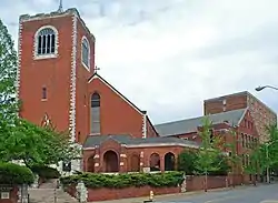 The church's current building was built in 1881[3] and opened for worship in 1888.[5] It was designed by New York City architect William Halsey Wood.[1][5] Its design, which features a prominent bell tower,[5] was modeled after a "typical English village church".[4] The sanctuary has a high wooden ceiling and side galleries; it can seat about 450 people.[4] The bell tower holds 11 bells that were cast by the McShane factory in Baltimore and dedicated in 1911.[4] Architectural historian Ron Ramsay has described the church exterior as having Georgian elements, while the interior is "much more Gothic and much more Victorian".[5] Wood used a similar design for churches in Kansas City and in La Crosse, Wisconsin.[4] The church was listed on the National Register of Historic Places in 1978.[1]