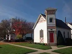 Both the church and the parish hall are rectangular wood-frame structures built on concrete block foundations that have been simulated to appear as rusticated stone.[3] The church's central tower is square in shape and it has a large diamond window centered on the front. The belfry is made up of eight chamfered columns with decorative gingerbread on its base and top. Located between the columns are crisscross braces that simulate a balcony effect. It is capped with a low pitched hip roof that is covered with tin. The belfry originally had a weather vane on top of it. The stained glass window above the main entrance of the church dates from 1870 and was originally a part of St. Barnabas Episcopal Church in Montrose, Iowa. It was given to St. Paul's in 1980 after St. Barnabas had been deconsecrated. Four lancet windows line the side walls.