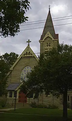 The present church building is the 1887 structure, for which the parish solicited prominent architect Gordon W. Lloyd after learning of his previous commissions in Michigan, Pennsylvania, and other parts of Ohio. One of Lloyd's last church buildings, it demonstrates the influence of Richard Upjohn.[3] The walls are sandstone, built on a stone foundation and covered with a slate roof.[4] Its floor plan is reminiscent of many other Anglican churches, with the typical tower atop the narthex and the rectangular nave. In a similar manner, the building is constructed in the shape of a cross, due to the construction of transepts connected to the chancel. Even the tower is reminiscent of traditional Anglican churches, due to the presence of a belfry with a steep pyramid-shaped roof and louvred openings.[3] The main body of the church features ogive windows and a gabled facade, while small cloverleaf-shaped windows are placed in the tower above the entrance and below the main windows.[4]