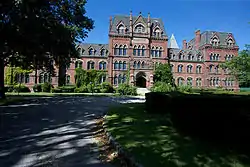 St. Paul's was built by Cornelia Stewart, widow of Alexander Stewart, and dedicated in his honor. This building is of High Victorian Gothic design. The architect was William H Harris, who had also designed the Cathedral of the Incarnation. The cornerstone was laid on June 18, 1879, with attended by Cornelia Stewart, her brother Charles Clinch, executor of Alexander Stewart's estate, Judge Henry Hilton, and Bishop Littlejohn, Protestant Episcopal Bishop of Long Island. It took James L'Hommedieu four years to complete construction of this massive E-shaped building. It was crowned with a slate roof and a clock and bell tower. There were laboratories, classrooms, libraries, several dining halls, kitchens, a large reception parlor, permanent workspaces for staff, a beautiful gothic chapel, with seating for 400, dormitory space for 300 students, with spacious interior apartments on the top floors for masters, i.e. teachers.[3]