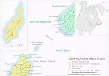 St. Paul Island (French: Île Saint-Paul) is a small uninhabited island located approximately 24 km (15 mi) northeast of Cape North on Cape Breton Island and 71 km (44 mi) southwest of Cape Ray on Newfoundland; it is along the boundary between the Gulf of St. Lawrence and the Cabot Strait.
