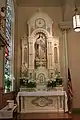 However, the interior style is not Spanish Colonial but rather Romanesque Revival. St. Peter Catholic Church is the oldest standing romanesque revival building in Alabama. The interior was styled according to a traditional rectangular basilica plan, used since the fourth century. Three custom wooden altars were installed in the 1890s, replacing less elaborate ones. They were made in a Victorian Romanesque style, painted cream, and trimmed in gold, and almost reached the ceiling. The high altar features a statue of Jesus in the middle with a separate angel statue on each side. The left altar displays a statue of the Virgin Mary and the right displays St. Joseph and The Holy Child. The interior also holds fourteen Victorian style, stained glass windows. Dating from 1922, these windows were made by Emil Frei Art Glass Co. of St. Louis and Munich in Germany. The small statues for the stations of the cross along the walls are made out of polychrome plaster.[1][4]