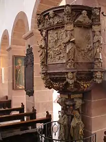 The nave was completed in the 12th century. In the early 13th century, the transept, east choir as well as the western and north western portals were finished. The late-Romanesque Buntsandstein cloister was built 1220–60. In 1490, the tower was added. Around 1772 the Baroque altar replaced the Gothic high altar.[6]: 16–7