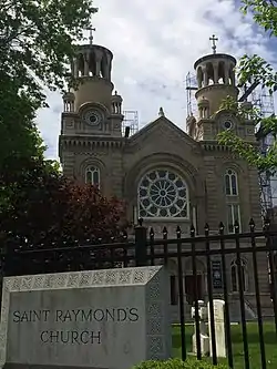 St. Raymond's Church is a parish church under the authority of the Roman Catholic Archdiocese of New York, located at Castle Hill Avenue at Tremont Avenue, The Bronx, New York City. The parish was established in 1842. It was dedicated on the feast of St. Raymond Nonnatus, on August 31, 1845, thus getting its name. There is a stained glass window, on the right side if you are looking at the sanctuary, of St. Raymond Nonnatus and the men who took him hostage.