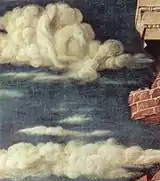 According to Battisti, the theme refers to the Book of Revelation. A rider is present in the clouds at the upper left corner. As specified in John's work, the cloud is white and the rider has a scythe, which he is using to cut the cloud. The rider has been interpreted as Saturn, the Roman-Greek god: in ancient times Saturn was identified with the Time that passed by and all left destroyed behind him.