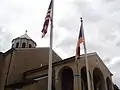 The Armenian and American flags in front of the church