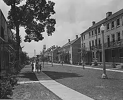 Initially the original site of the Irish Channel, bordered by Tchoupitoulas and St. Charles, between Felicity and Phillip streets, St. Thomas Development was one of the oldest housing projects of New Orleans. It was bordered by St. Thomas Street to the south, a service alley between Constance and Laurel Streets to the north, Felicity Street to the east, and Josephine Street to the west. St. Thomas housing development was originally designated for white occupants only. After the Civil Rights Act of 1964, all of the city’s public housing projects were desegregated. At that time, the residents were a group of racially diverse, low-income, working-class families. In the mid/late 60s, many of these families were forced out when the federal government decided that their income was too high. At the same time, there was a decrease in social services in the housing developments – a decrease many attribute to the money going into the Vietnam war.[3] The exodus of industry from the inner city plunged the St. Thomas residents into great poverty, and subsequent White flight meant that, in recent years, residents have been primarily African American. Living conditions and crime became a problem during the mid-1970s when Heroin flooded the project. Problems in St. Thomas continued throughout the '80s and '90s. In 1996, the Housing Authority of New Orleans received a H.U.D. Hope VI grant to demolish and rebuild the area. The grant included the costs of relocating the nearly 3,000 then-residents to other properties.