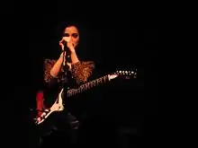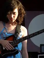 Possessing a mezzo-soprano voice,[94][95][96] Clark's music has been noted for its wide array of instruments and complex arrangements, as well as its polysemous lyrics, which have been described as teetering between "happiness and madness".[26] In response, Clark has said, "I like when things come out of nowhere and blindside you a little bit. I think any person who gets panic attacks or has an anxiety disorder can understand how things can all of a sudden turn very quickly. I think I'm sublimating that into the music."[16] In addition to guitar, Clark also plays bass, piano, organ, and theremin. Her music also often features violins, cellos, flutes, trumpets, clarinets, and other instruments.[97] Her musical style has been characterised as rock,[98][99] pop,[100][101] art rock[102][100] and indie rock,[103][104] incorporating a wide range of influences including experimental rock, chamber pop, electropop, soft rock, and cabaret jazz.[29][105]
