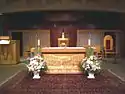 The postwar years of the 1950s and '60s saw many changes come to the physical plant of the Parish that reflected the housing boom of the area, the economic upswing of the times and the growing parish population. Many of the original "Motley Buildings" were completely replaced. The Middle School (Junior High/Upper School) building was built and later an additional floor was added. When consideration was had for the completion of the Upper Church, it was found that the basement church was not structurally sufficient to support additional construction. In 1955, the old church was demolished to make way for the current granite and sandstone building designed by the Gleeson & Mulrooney Architectural firm. The first mass was said in the new church (lower) on December 25, 1956.[6] This Church, now the parish's third, seated 1,000. All of the stained glass windows and some appointments were used from the second church. While structurally complete the parish was still without a "Main Church" as construction debts prohibited completion of the interior of the Upper Church (seating 1,250) until June 1963.