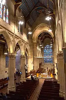 The original furniture of the chancel, of which most remains, is of different dates, but for the most part in the Gothic style. The original choir stalls, of dark English oak, are particularly fine, having large poppy heads, each richly carved with a different foliate design. These were removed under Dean Phillip Jensen, but were reinstated following his departure.