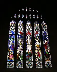 The windows fall into three classes, stained glass with their protective glazing, leaded light windows and plain windows or other miscellaneous windows. The building contains many fine stained glass windows by local stained glass artists including Ashwin and Falconer and Norman Carter.[2]
