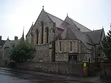 St Andrew the Apostle (in full, the Church of St Andrew the Apostle) is an Anglican church in Worthing, West Sussex, England. Built between 1885 and 1886 in the Early English Gothic style by Sir Arthur Blomfield, "one of the last great Gothic revivalists",[1] the church was embroiled in controversy as soon as it was founded. During a period of religious unrest in the town, theological tensions within Anglicanism between High church Anglo-Catholics and Low church Anglicans were inflamed by what the latter group saw as the church's "idolatrous" Roman Catholic-style fittings—in particular, a statue of the Virgin Mary which was seized upon by opponents as an example of a reversion to Catholic-style worship in the Church of England. The "Worthing Madonna" dispute[2] delayed the consecration of the church by several years. English Heritage has listed the building at Grade C for its architectural and historical importance, and the adjacent vestry and vicarage are listed separately at Grade II.