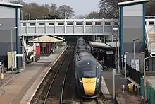 The main building is on the south side of the line, nearest the town centre and facing the bus station. It was built in 2001 to a design by Lacie Hickie Caley.[15] and contains a booking office and shop. The wooden building on this platform dates from Great Western Railway days. The station car park is situated behind this platform. An accessible footbridge links the two platforms.