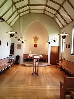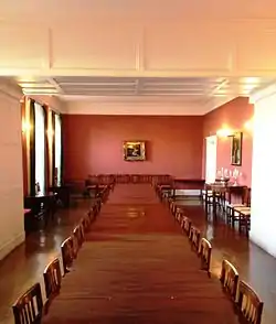 The interior has a cramped floor-plan. The dining hall took up most of the ground floor, and the common room and library were above that. The chapel is a red brick garden annexe in a vaguely Gothic style.