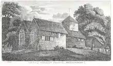 The earliest mention of the church is in the Norwich Taxation of 1254 and by the Lincoln Taxation of 1291 it the church was held by the Cistercian Abbey of Strata Marcella near Welshpool.[4] Fortunately two illustrations exist of the earlier church at Berriew, which was demolished in 1802. The first watercolour of 1796 was commissioned by Thomas Pennant from the artist John Ingleby. Pennant was intending to re-publish his Tours in Wales and to use this as an illustration. In his original tour in July 1776, he had visited Vaynor Park in Berriew, although he does not mention the church. John Ingleby shows the church from the South East with a typical Montgomeryshire bellcote. He also shows the chapel on the North East side of the Church, which, at that time housed a monument to Arthur Pryce of Vaynor Park, who died in 1597. The second depiction of the Church is a print of 1798 by the Rev William Parslow. It was published in the Gentleman's Magazine in 1800. It shows the church from the North West, with the chancel chapel in the foreground and the bellcote with a clock. A lych gate can be seen on the right in the same position as the present lych gate. The church is raised up on a slight mound.